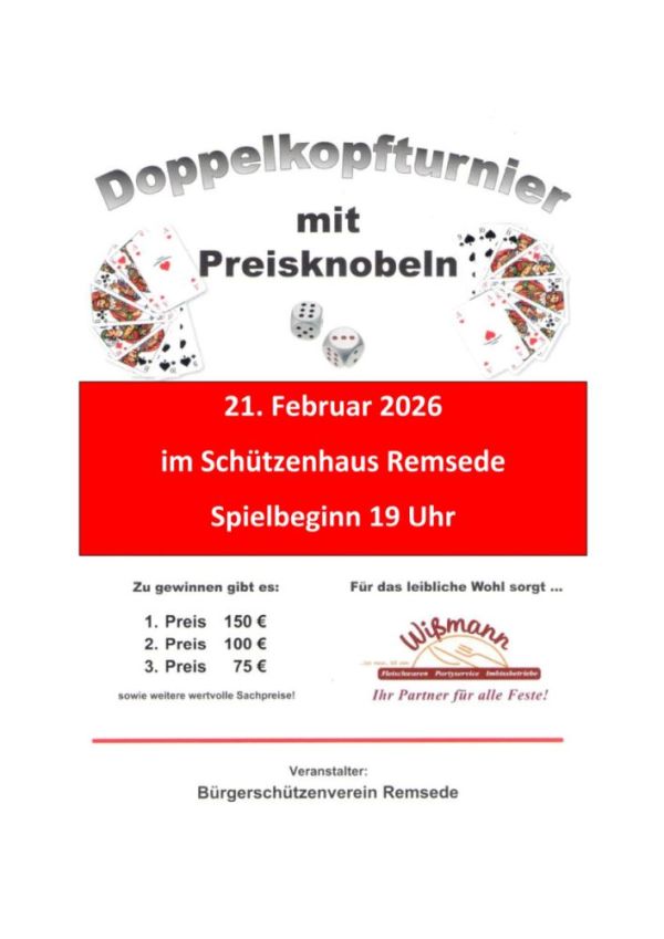Unser Doppelkopfturnier findet wieder statt. Es erwarten euch tolle Preise, die ihr euch nicht entgehen lassen solltet. Schnappt euch eure Freunde und Familien und kommt zum Schützenhaus.